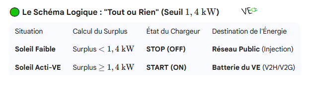 Le système ne s’enclenche qu’à partir d’un surplus de 1,4 kW. En dessous de ce seuil, le chargeur bidirectionnel ne démarre pas pour éviter les pertes de conversion inutiles. C’est la garantie d’une efficacité maximale pour votre installation solaire.