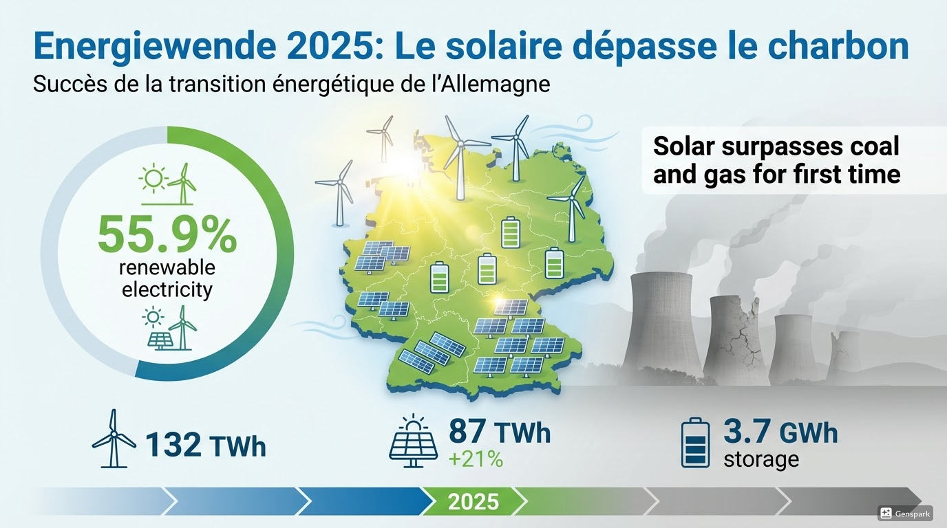 Article réactualisé en février 2026 – Les données 2025 confirment que la transition énergétique allemande est non seulement réussie, mais qu’elle s’accélère malgré les défis. Le solaire dépasse désormais le charbon, l’éolien reste la première source d’électricité, et les batteries de stockage transforment le système électrique. L’Allemagne trace la voie vers un avenir 100% renouvelable ! 🌱⚡