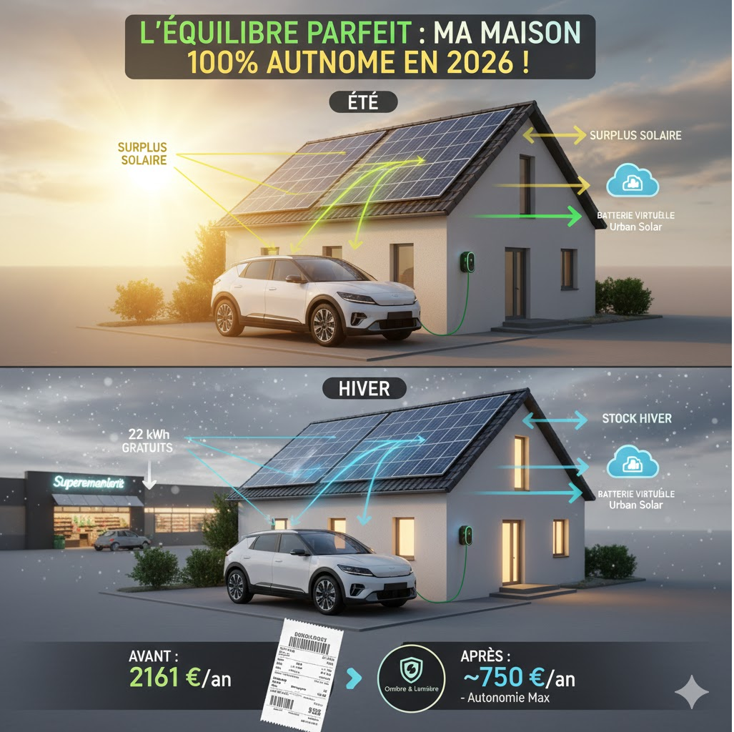 - Déstockage Virtuel : La nuit, vous complétez la charge de l’EV3 via votre réserve accumulée l’été chez Urban Solar. Vous ne payez que les taxes d’acheminement (environ 0,095 €/kWh).