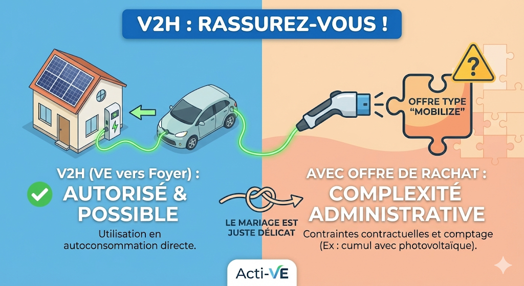 Le V2H solaire n’est PAS interdit, il est simplement non géré par l’offre standard actuelle de Mobilize Power pour des raisons de simplification administrative.