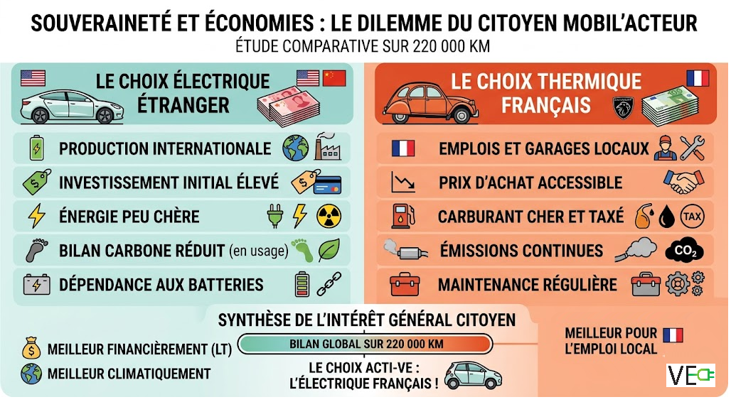 - ⚡ VE ÉTRANGER : 🏭 Dette carbone initiale forte (fabrication batterie). MAIS « remboursée » rapidement grâce au mix électrique décarboné français. Impact CO2 global bien plus faible sur 220k km.